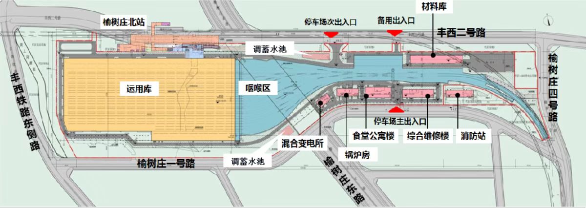 北京地铁十六号线27标榆树庄停车场项目位于北京市丰台区榆树庄,北侧紧临铁路规划动车段,用地呈东西向布置,